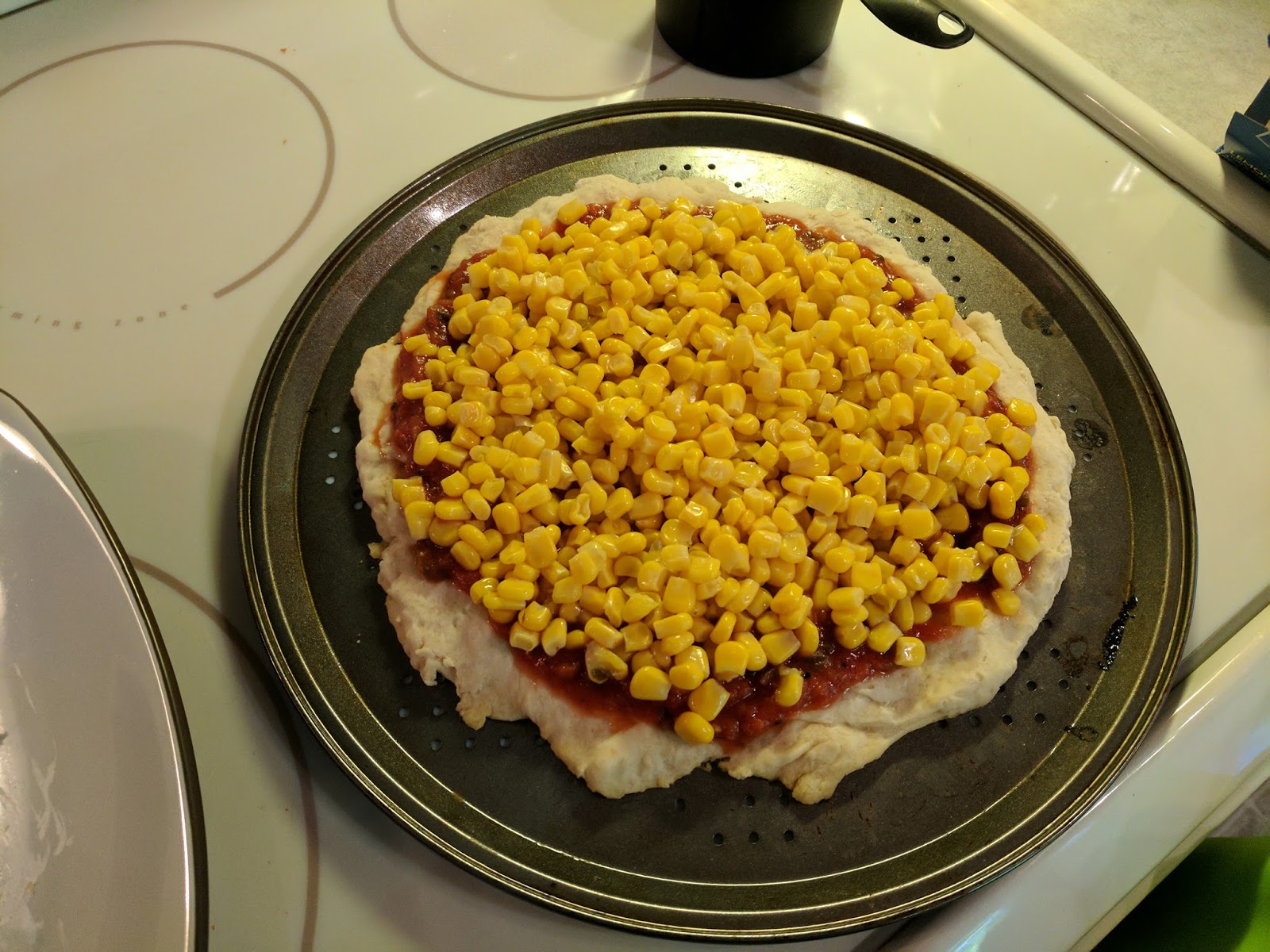12-inch pizza pan. Spread salsa over crust. Top with corn, chicken, olives and