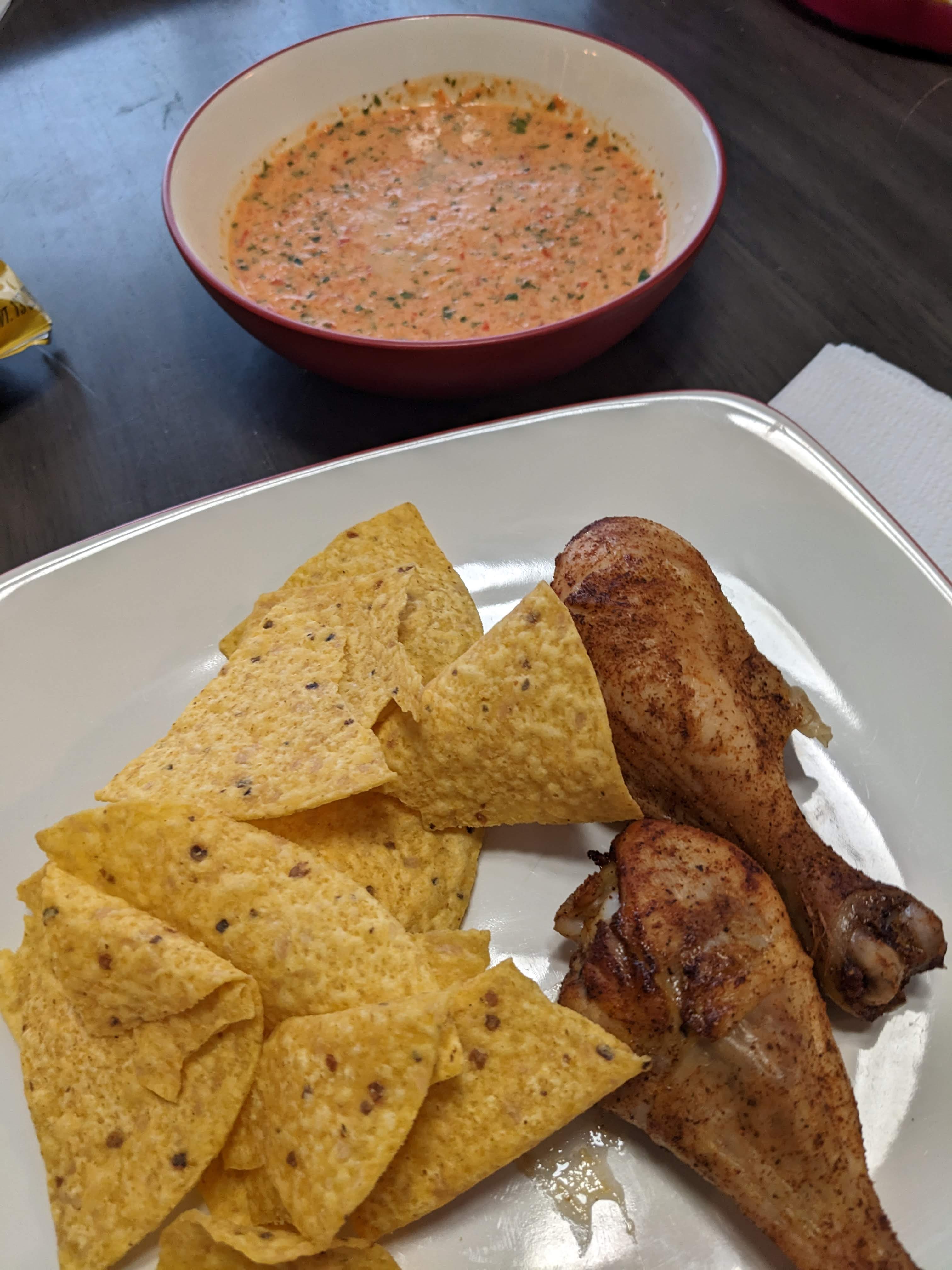 | Served with chips and some pre-marinated chicken drumsticks from Kessler's. |